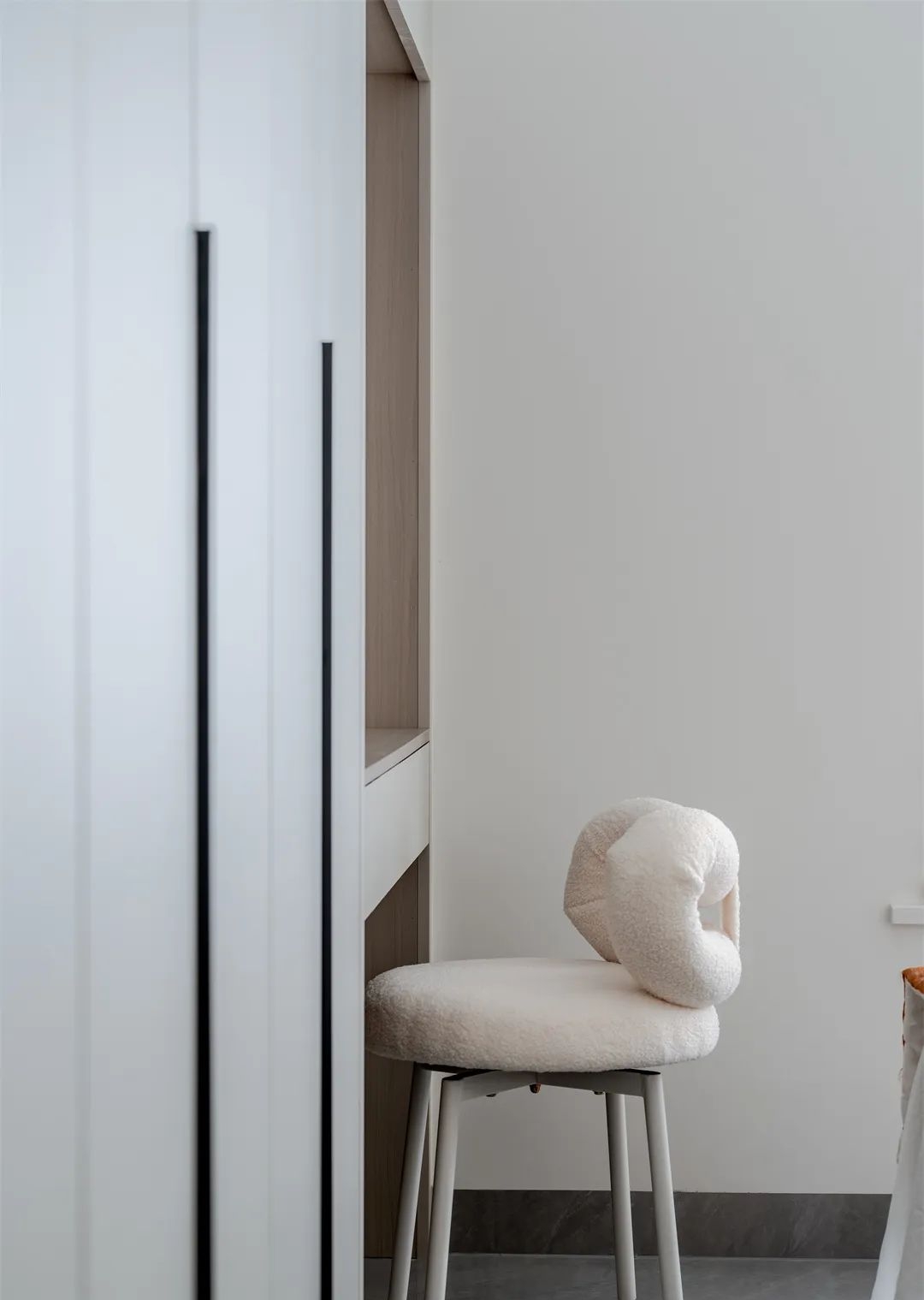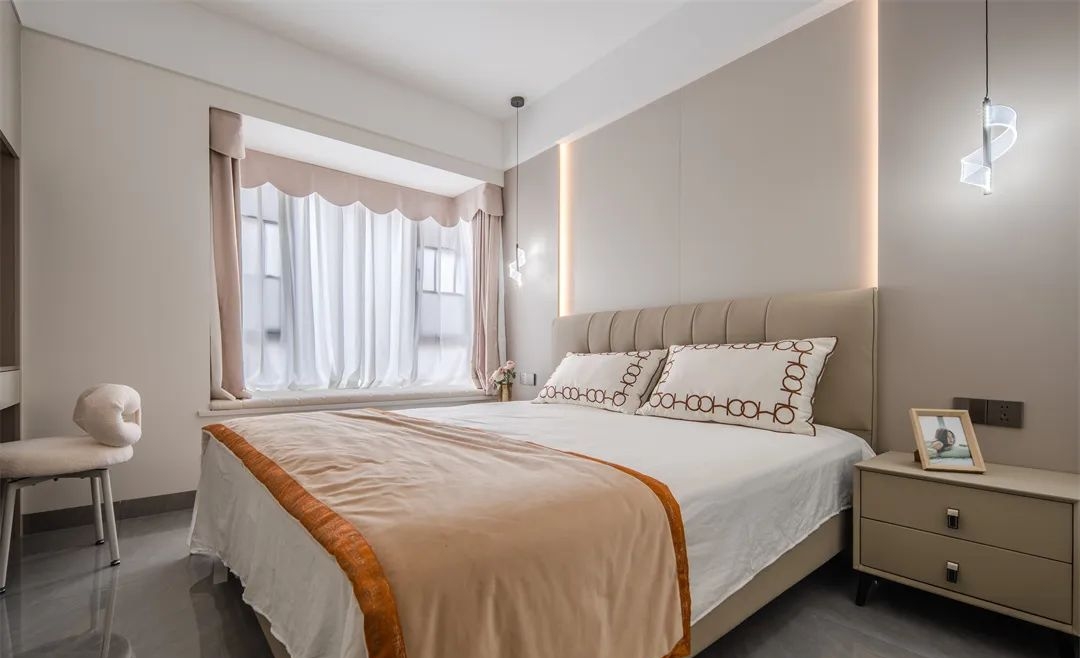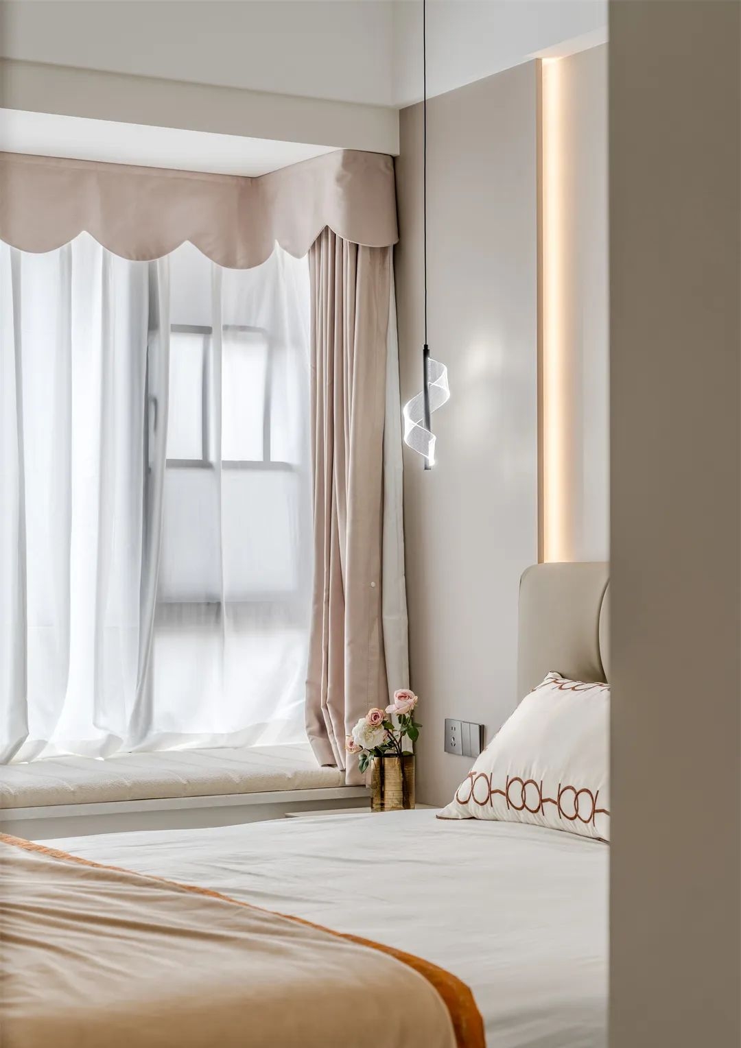 ▲ 主卧,整体实用浅色调,加以暖黄色点缀,营造舒适温馨的睡眠氛围。保留了飘窗一遇,加铺软糯的白色软垫,打造卧室休闲区。