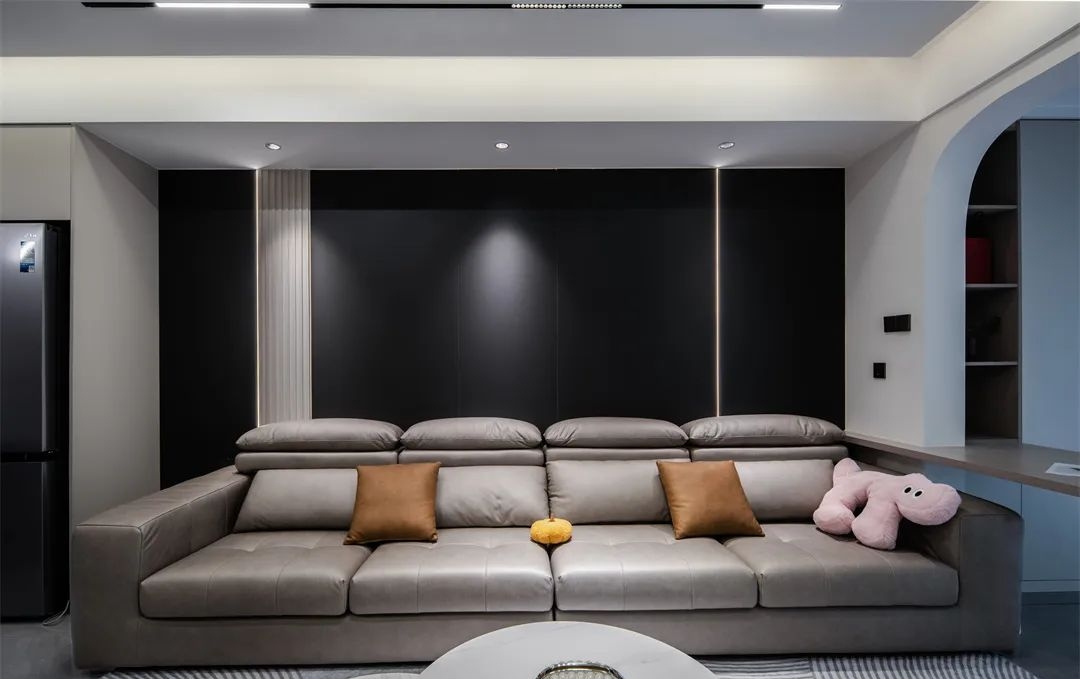 ▲ 挑选大气优雅的高级灰沙发,与黑色板材构成的背景墙相辅相成,带来丰富的层次效果。辅以橙色抱枕、粉色玩偶点缀,调和清冷感。