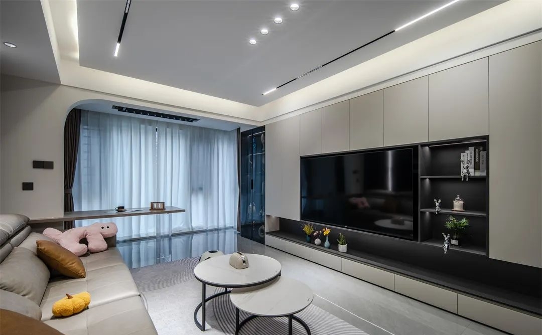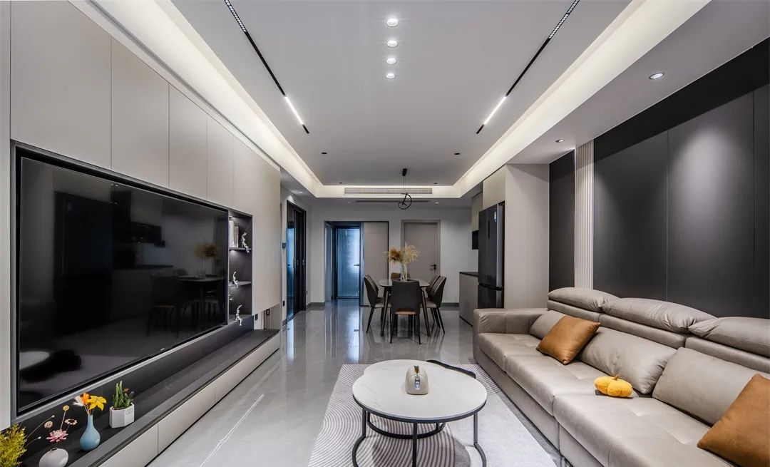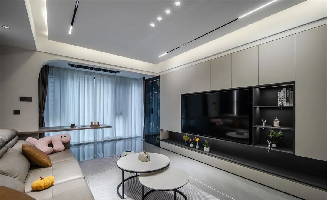 ▲ 定制黑玻展示柜与电视墙结合,一柜到顶设计,保证空间连贯与统一。封闭柜门+开放格的组合,将插座与电线完美隐藏,视觉更完整。
