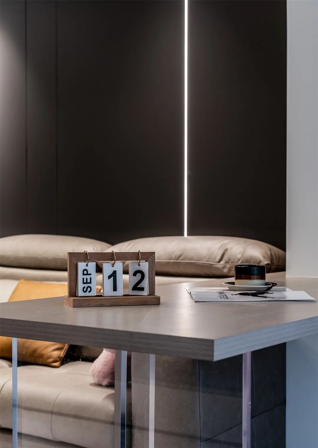 ▲ 沙发右侧从墙体延伸出悬浮长桌,连接阳台与客厅两个空间,可作边几置物,也可作为茶桌,根据需求灵活调整,赋予空间更多可能。