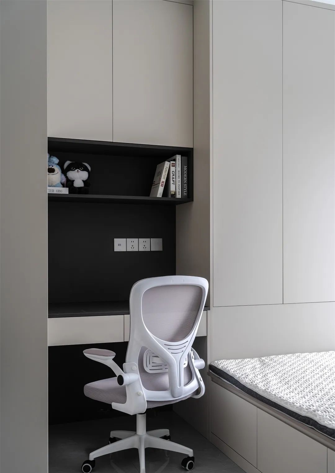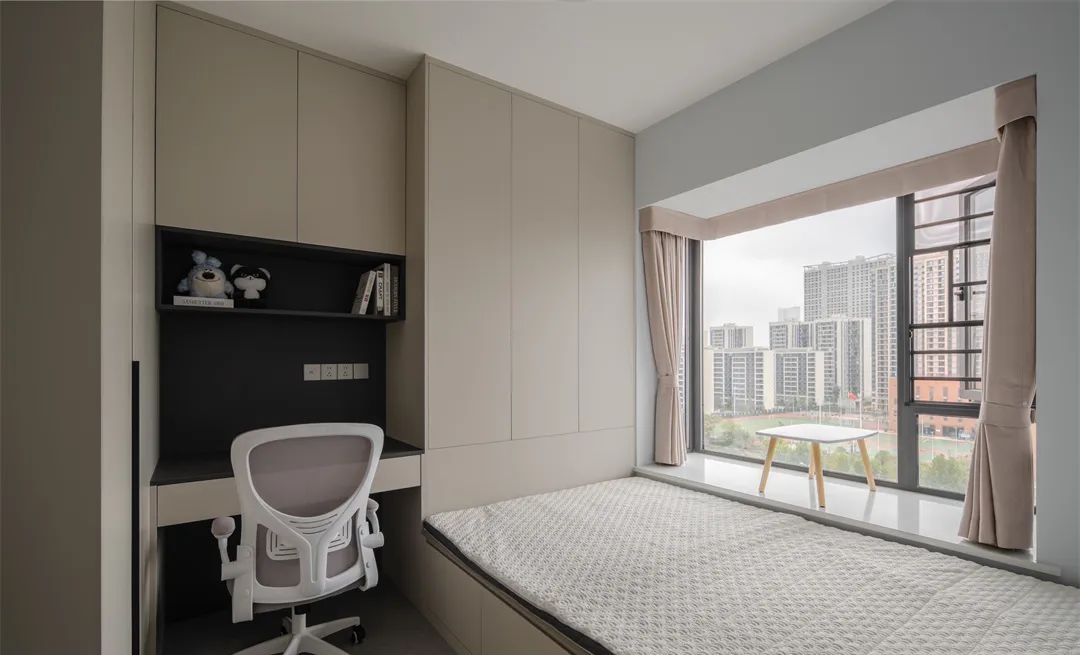 ▲ 儿童房延续整屋格调,简约舒适。沿窗定制榻榻米,与飘窗严丝合缝,为规划学习区预留足够空间。低饱和配色营造干净清爽的氛围。