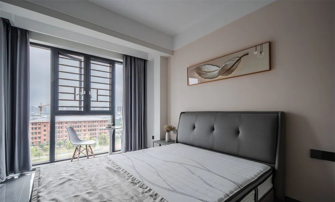 ▲ 次卧,拥有超大阳台+落地窗设计,窗外风景一览无余。背景墙以浅色乳胶漆填充,抽象艺术画上墙修饰,带来干净舒适的视觉感受。