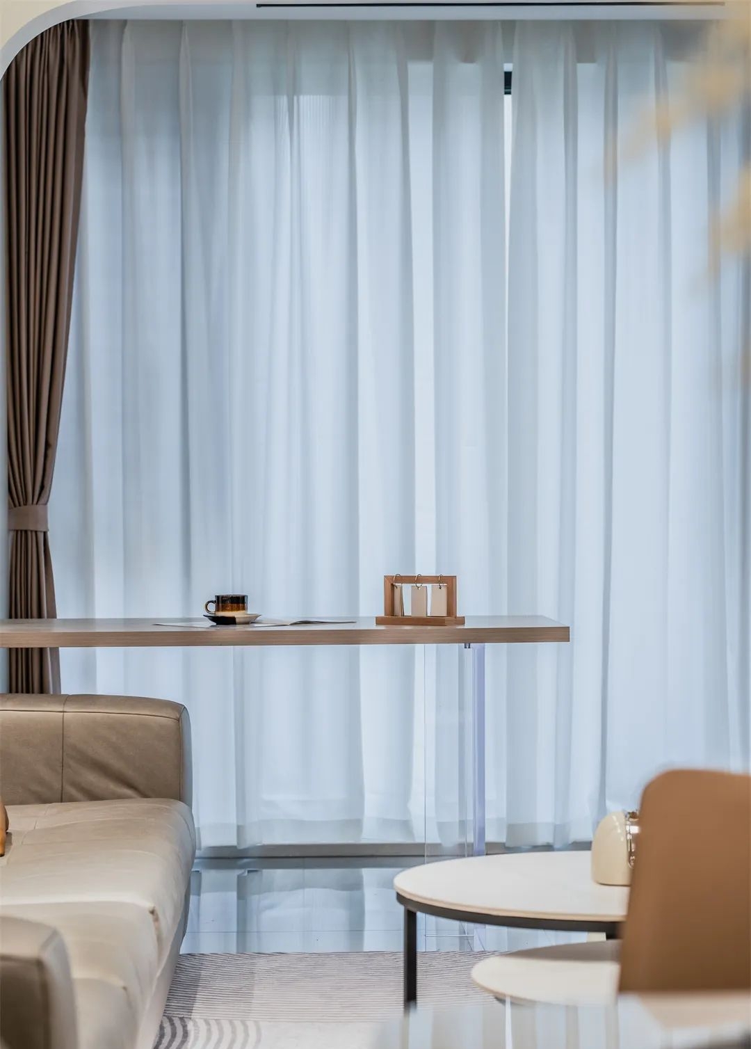 ▲ 梦幻轻盈的白色窗帘,将光与影反反复复雕塑,落至空间的每一个角落。超长悬浮木质桌,摆上小巧精致的装饰品,雅致而惬意。