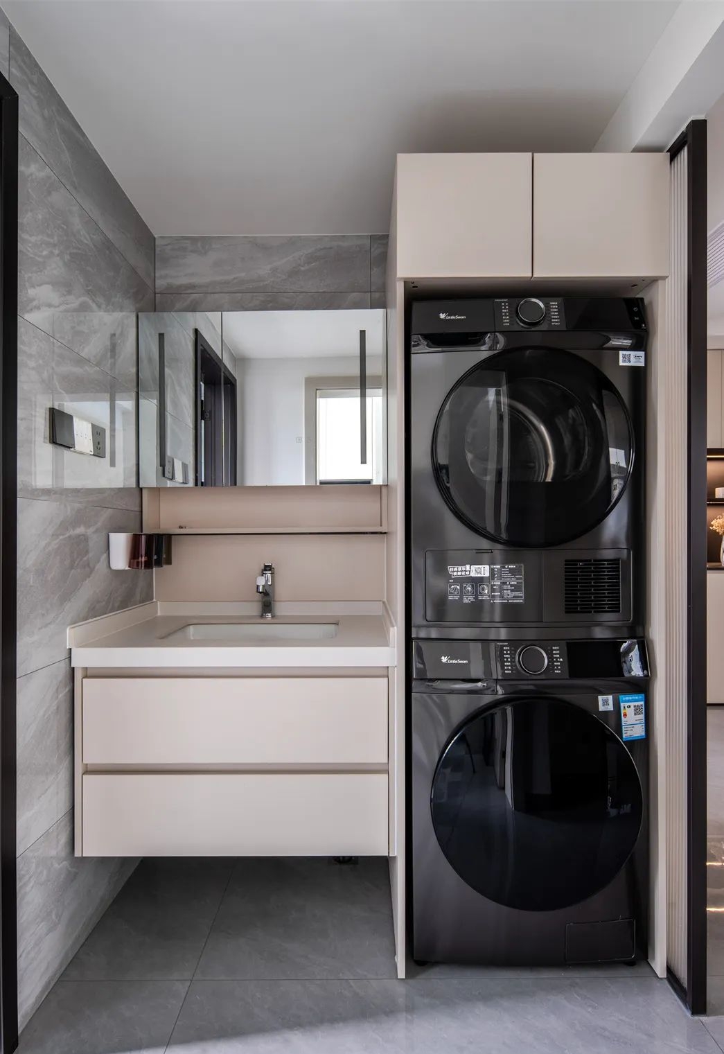 ▲ 客卫,将干区外移,洗手台右侧叠放纳入洗衣机与烘干机,实现空间的多种功能。主卫墙体一体设计,功能齐全,简洁的陈设落落大方。