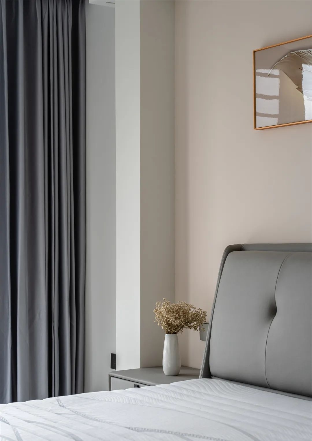 ▲ 灰色高背床头与床头柜保持统一色系于材质。挑选清冷中性调的床品、窗帘,辅以干净利落的线条修饰,构建舒适静谧的适眠空间。