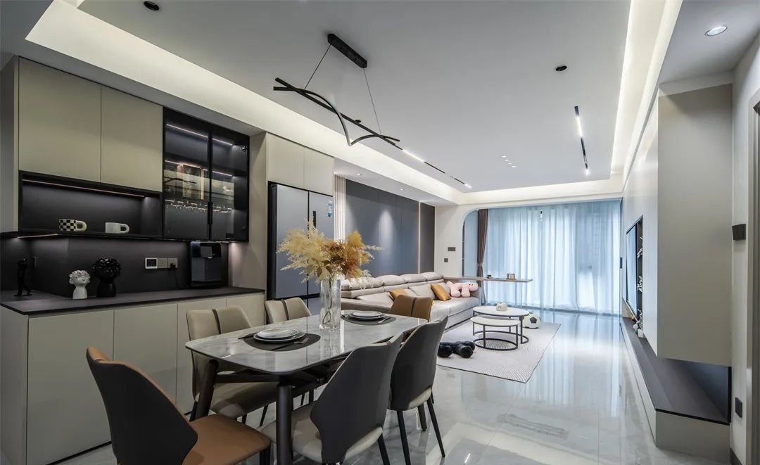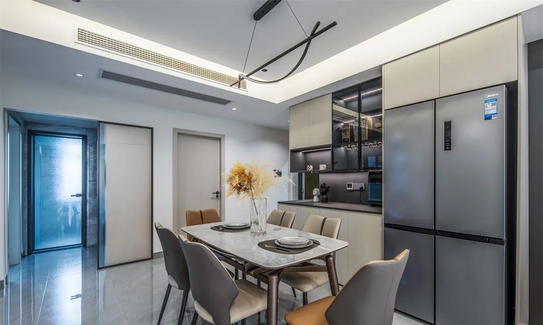 ▲ 沿墙打造整排餐边柜,柜体颜色材质与电视墙呼应,于左侧预留部分空间方便将冰箱内嵌,为厨房减压,多功能的设计满足更多需求。