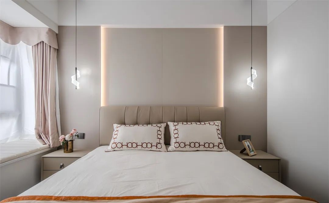 ▲ 浅咖色床头与背景墙融为一体,内嵌灯带设计+别致的艺术吊灯,丰富照明层次。不同于公区的冷色系,色彩温柔使得空间满是生机。