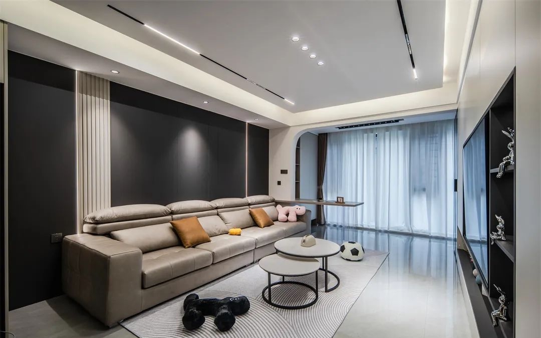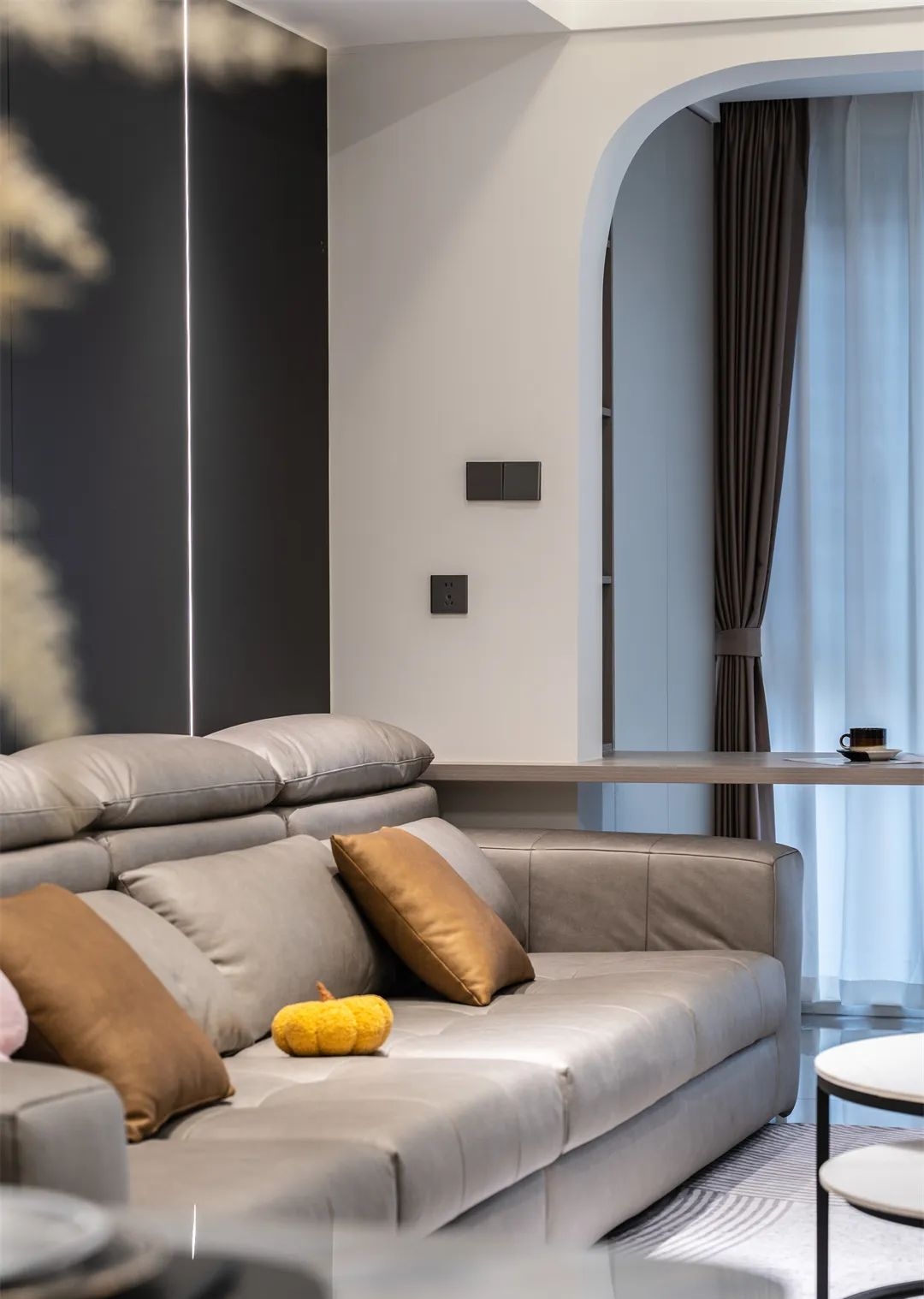 ▲ 客厅纳入阳台扩大使用面积与采光,拱形门设计柔和空间棱角。灰色哑光砖一路通铺,结合简洁大气的无主灯布局,极具高级感。